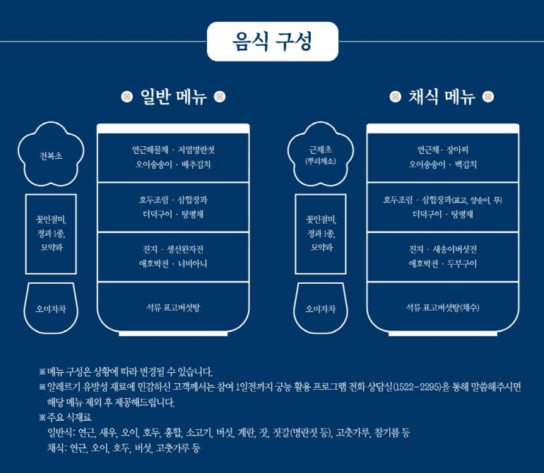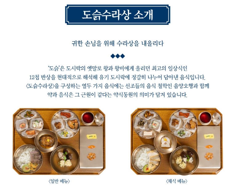 외소주방에서 체험할 수 있는 궁중음식인 도슭수라상입니다. 일반 메뉴와 채식 메뉴로 구분되어 육식을 하지 않으시는 분께도 만족을 드릴 수 있습니다.