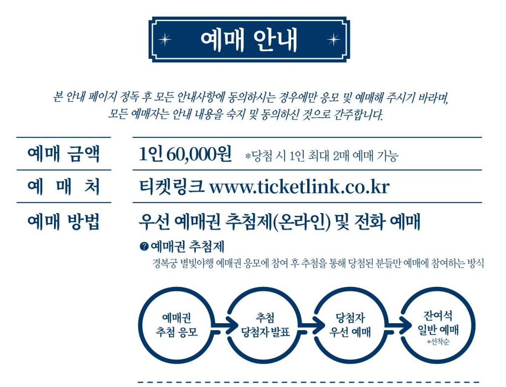 경복궁 별빛야행은 사전 신청자 중 무작위 추첨을 통해 당첨자에게 예매 권한을 부여하는 방식으로 진행됩니다. 당첨자는 예매 기간 동안 날짜, 회차, 좌석을 직접 선택하고 결제해야 합니다.