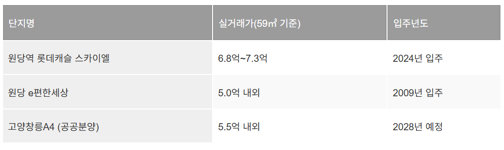 A. 원당역 롯데캐슬 스카이엘과 비교 시 유사하거나 다소 낮은 수준입니다. 분양가상한제가 적용되지 않는 비규제 지역의 시세 수준을 반영했다고 볼 수 있습니다.