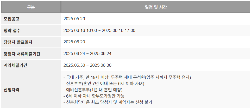 - 청약통장, 소득, 자산 요건 없음 (단, 자산 상한 3억 6,200만 원 이하)