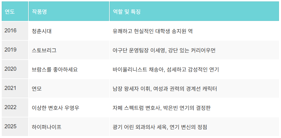 박은빈의 필모를 보면 ‘믿고 보는 배우’라는 말이 절로 나와요. 그녀가 출연한 주요 작품들을 정리해보면 다음과 같습니다.