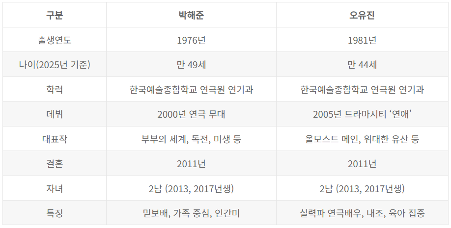 결혼은 2011년 조용히 치러졌고, 두 사람은 지금 슬하에 2013년생, 2017년생 두 아들을 두고 있습니다. 오유진은 연기 활동을 거의 중단하고 육아에 전념하고 있으며, 박해준은 가족을 ‘연기의 원동력’이라 표현할 정도로 가정을 소중히 여깁니다.