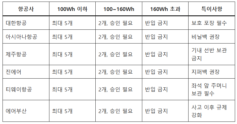 항공사별로 기내에 반입이 가능한 보조배터리 수량 및 보관 규정을 확인하세요