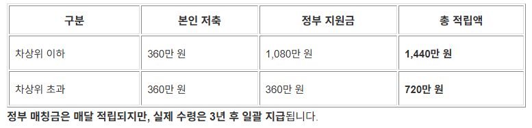 예를 들어, 차상위 이하 청년이 3년 동안 성실히 납입하면, 360만 원 저축 + 1,080만 원 지원 = 1,440만 원 수령이 가능합니다.