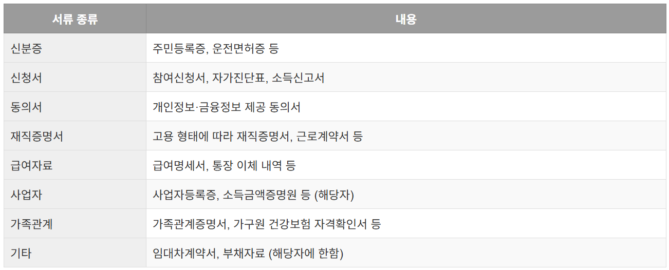 - 신분증, 근로 소득 확인 서류, 가구원 정보 등 필요 서류 함께 제출