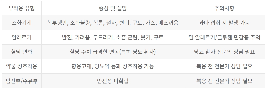 체질이나 건강 상태에 따라 부작용의 발생 빈도와 강도는 다를 수 있으므로, 처음에는 소량으로 시작해 점진적으로 양을 늘리는 것이 권장됩니다