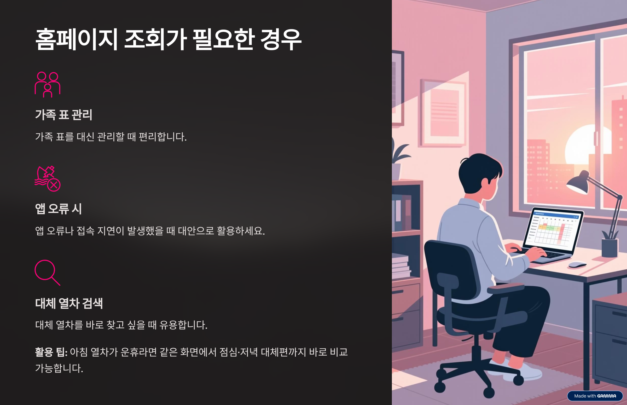 활용 팁 : 아침 열차가 운휴라면 같은 화면에서 점심·저녁 대체편까지 바로 비교 가능