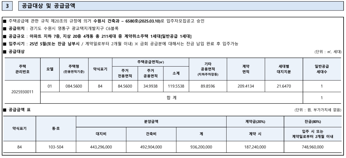 ✔ 전용 84㎡: 수원시 거주 무주택 세대주만 신청 가능