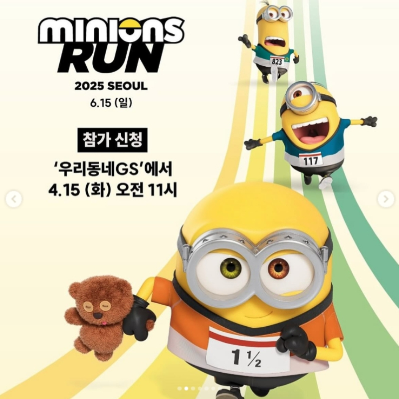 2025 미니언즈 마라톤, 그저 달리기만 하는 마라톤이 아닙니다. 가족, 연인, 친구와 함께 귀엽고 신나는 하루를 만들고 싶다면 지금 바로 우리동네GS 앱을 켜고 사전 접수를 준비하세요. 웃음과 추억이 함께 달리는 러닝 페스티벌, 절대 놓치지 마세요!