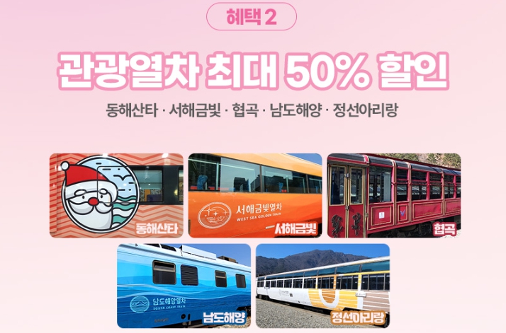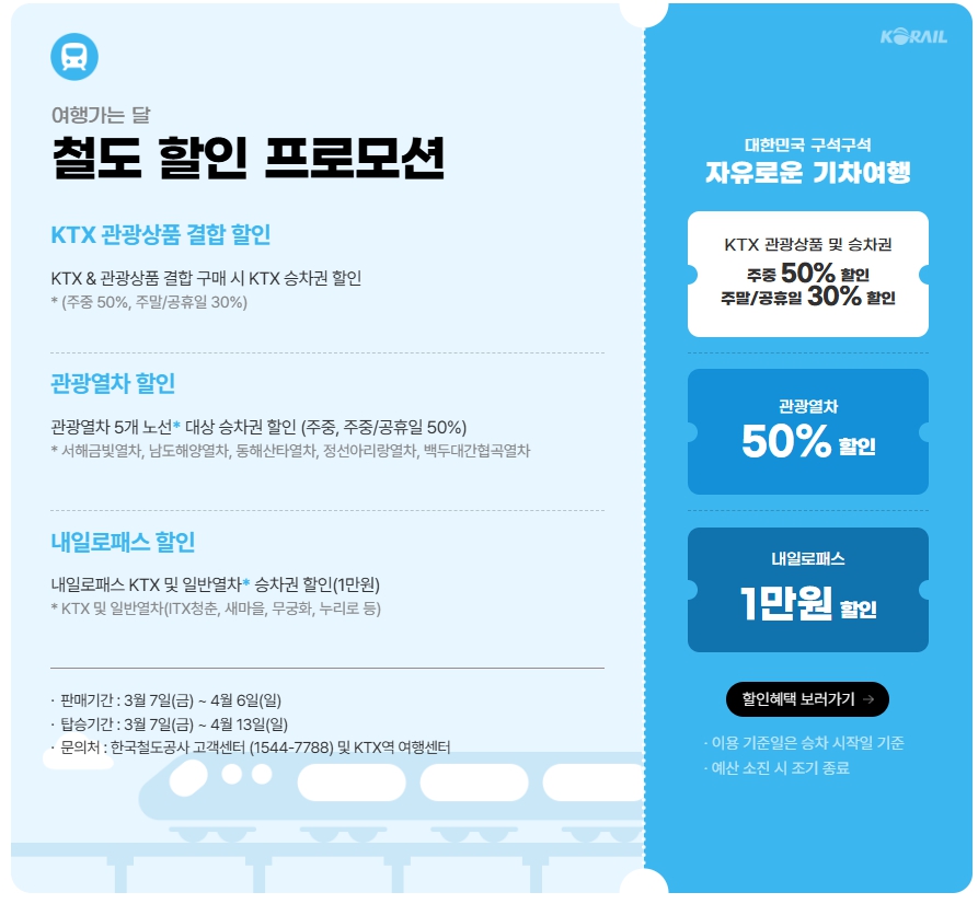 - KTX 및 일반열차(ITX청춘, 새마을, 무궁화, 누리로 등) 1만원 할인 제공