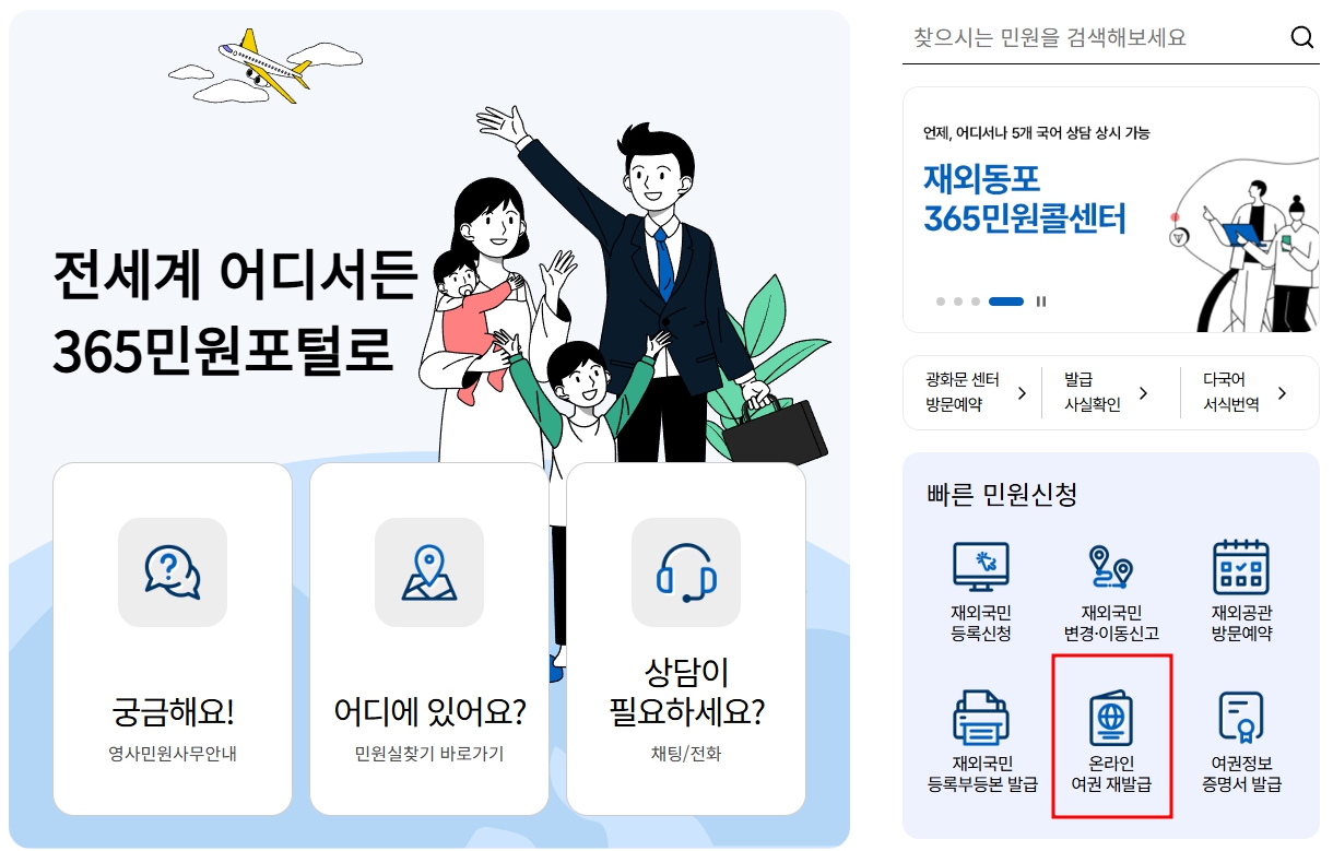이제는 정부24와 재외동포365민원포털을 통해 여권 재발급을 빠르고 편리하게 신청할 수 있습니다.